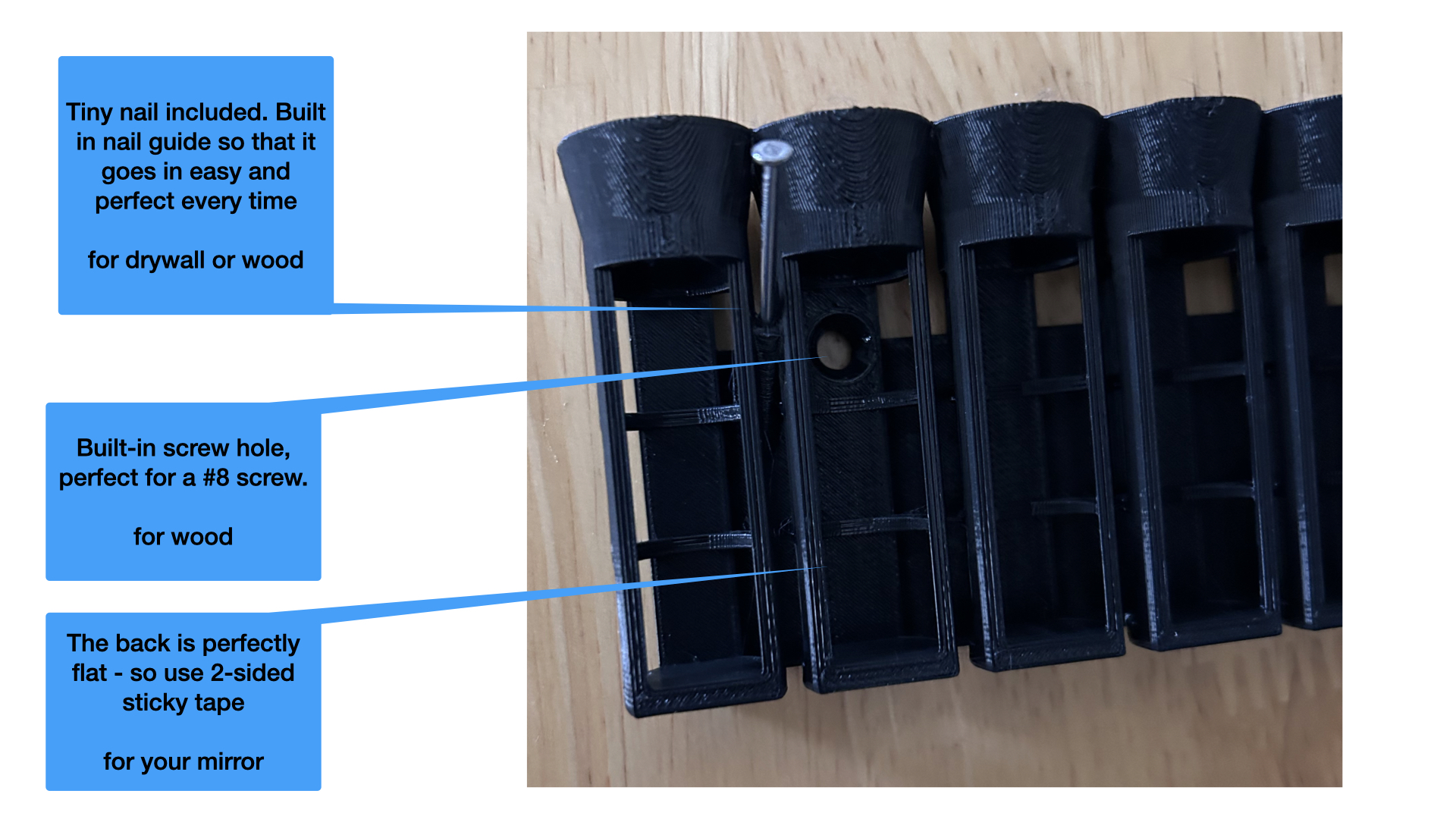 - Quick and Easy Installation: Choose between using small nails (included) for wall mounting or double-sided sticky tape for mirrors or other smooth surfaces—no complicated setup required.
